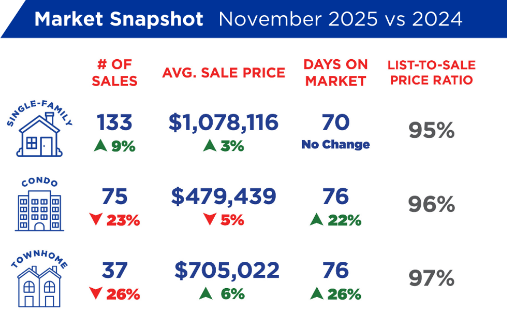 Even so, sellers have reasons to feel encouraged. Prices have stayed stable, with year-to-date averages holding up well across most property types. Well-presented homes continue to draw strong attention, especially when they show value and move-in readiness. A slowdown in new listings this month also helps keep supply from climbing too quickly, often setting the stage for improved activity early in the new year. Historically, low interest rates paired with fresh January inventory tend to bring motivated buyers back into the market.